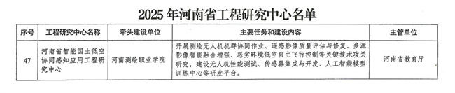 本网讯 近日,河南省发展和改革委员会发布《关于河南省材料智能设计与智能制造工程研究中心等140个省工程研究中心的批复》(豫发改高技〔2025〕724号),正式公布2025年度河南省工程研究中心认定名单。由河南测绘职业学院牵头申报的“河南省智能国土低空协同感知工程研究中心”成功获批立项。该中心是河南测绘职业学院首次获批由省发改委组织实施的省级自主创新平台,标志着学校在省级科研平台建设方面取得又一重大突破。