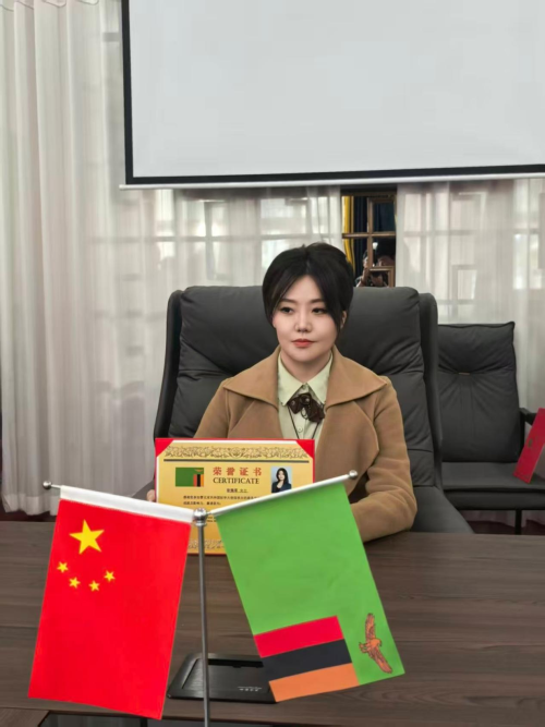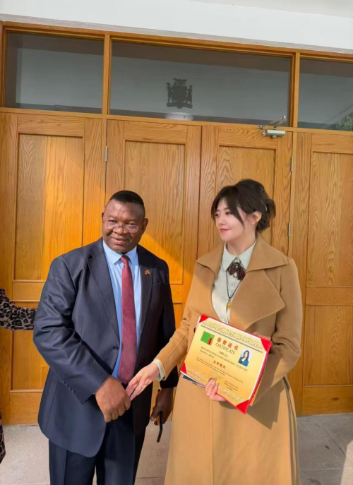 赞比亚驻华大使伊文·齐乌卢先生亲自为来自陕西西安的律师靳懿霏女士颁发"法律顾问"证书,标志着中赞法律合作迈入新阶段。
