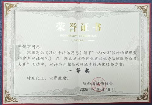 陕西省声闻律师事务所党支部书记、主任靳懿霏律师提交的研究成果《习近平法治思想引领下“1+6+6+3"涉外治理模型构建与实证研究》,在省市两级参评项目中脱颖而出,荣获开拓新兴领域类模块化服务方案一等奖。