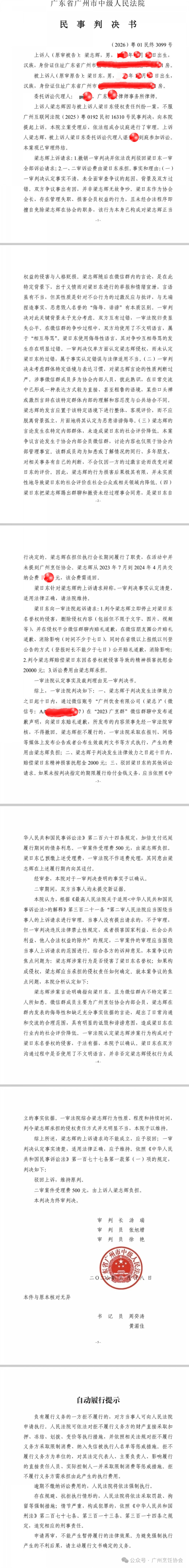 近日,广东省广州市中级人民法院就我会会长梁日东与梁志辉之间的名誉权侵权责任纠纷一案作出(2026)粤01民终3099号终审民事判决,依法驳回梁志辉的上诉请求,维持广州互联网法院一审原判。该判决为终审判决,现已发生法律效力。