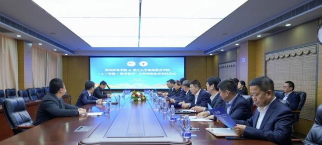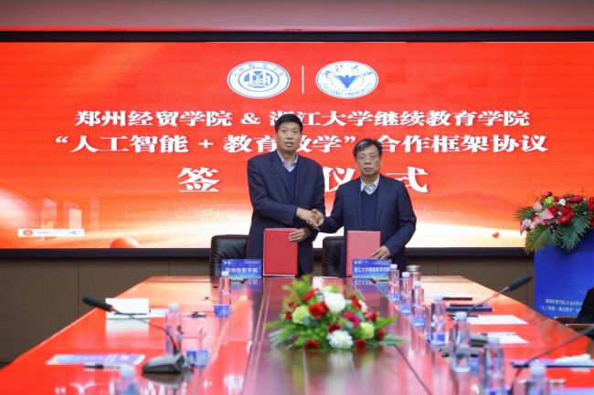 3月20日上午,郑州经贸学院与浙江大学继续教育学院“人工智能+教育教学”合作框架协议签约仪式在郑州经贸学院3303会议室举行。浙江大学继续教育学院党委书记、全国干部教育培训浙江大学基地副主任王志强一行,嘉宏控股集团总裁吴邦东,郑州经贸学院党委书记张树岭、执行校长陈丙义等双方核心领导班子出席仪式。此次签约是双方深入落实国家“人工智能+”行动、推进教育数字化战略落地的重要举措,将为中原地区应用型本科高校高质量发展注入全新动能。仪式由郑州经贸学院副校长褚吉瑞主持。